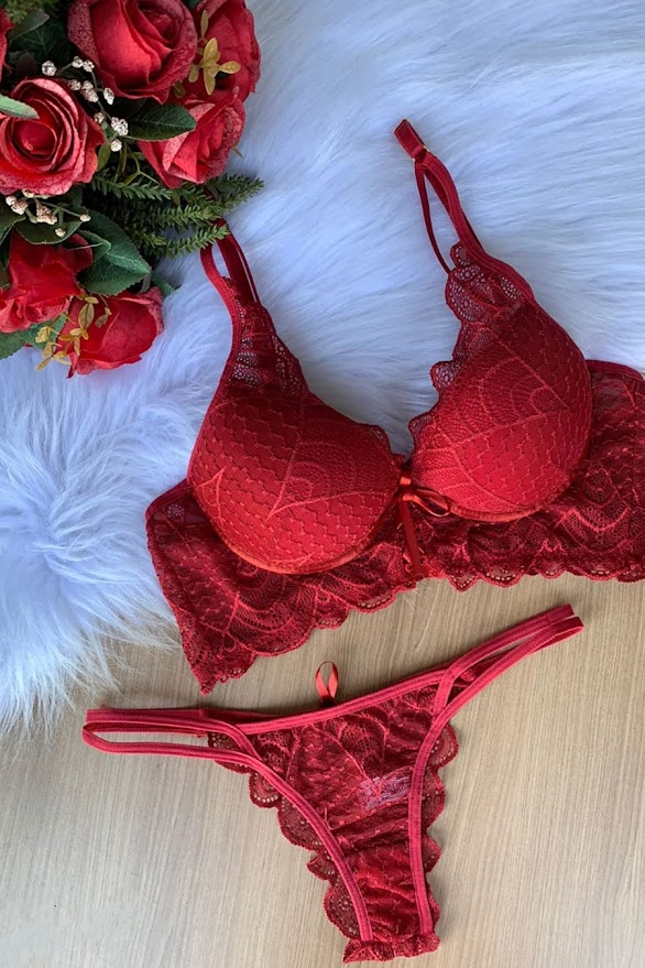 Conjunto aro, detalhe trançado em fitilho de cetim em meio aos seios, fecho duplo e reguladores nas alças, Calcinha fio duplo, detalhe trançado de fitilho de cetim no bumbum, conjunto mais alongado no corpo, todo trabalhado em delicada renda de flores, os reguladores são folheados a ouro 24 K.