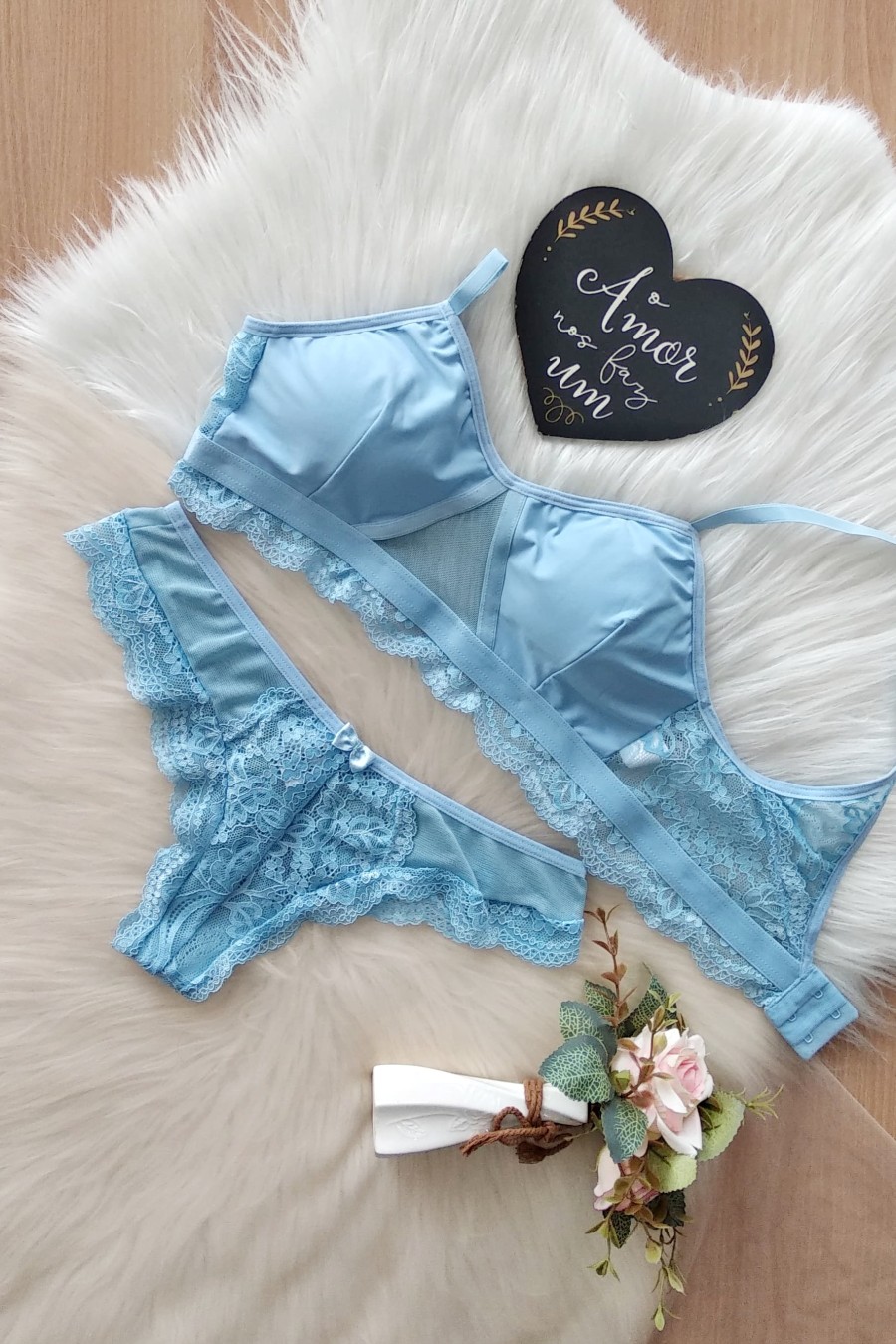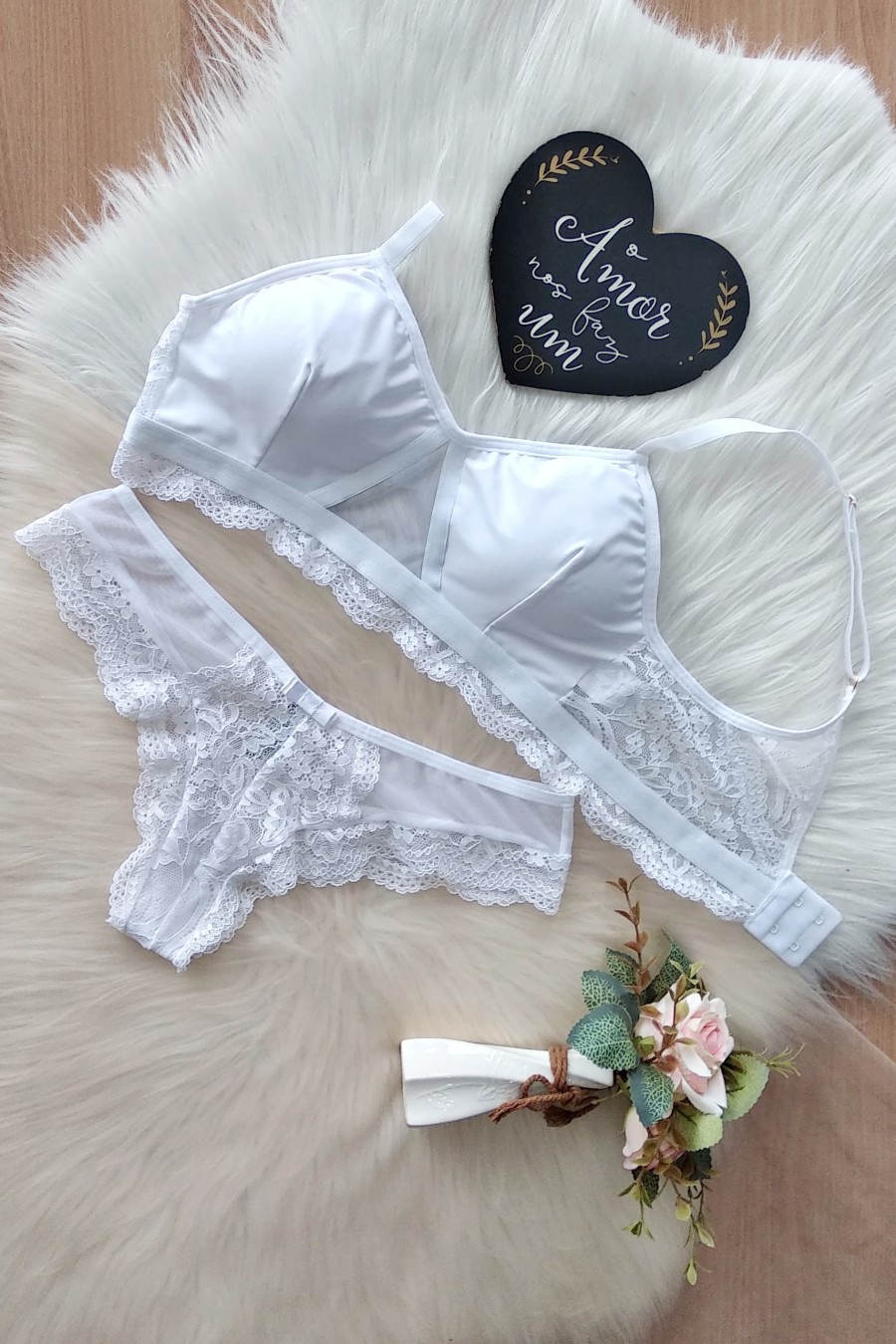 Conjunto com bojo removível, sem aro, detalhe tiras e tule meio ao bojo em microfibra de poliamida, costas em renda com fecho duplo, alça com reguladores folheados à ouro 24K , Calcinha fio duplo em renda e detalhe em tule, fundinho 100% algodao.