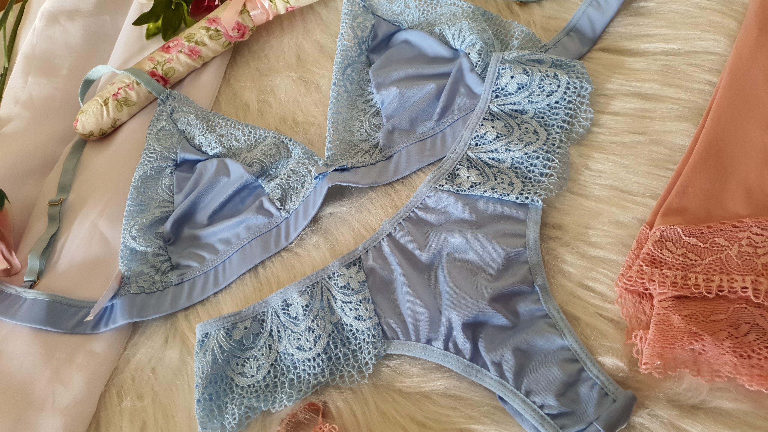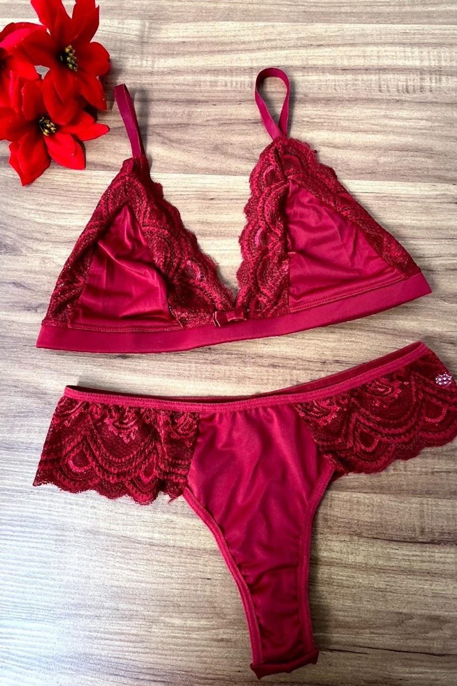 Sutiã sem bojo e sem aro todo trabalhado na microfibra de poliamida com detalhes em renda, tira larguinha abaixo dos seios para maior sustentação, que corre para as costas com fecho duplo, reguladores em metal nas alças, Calcinha fio duplo em microfibra com renda larguinha na lateral.